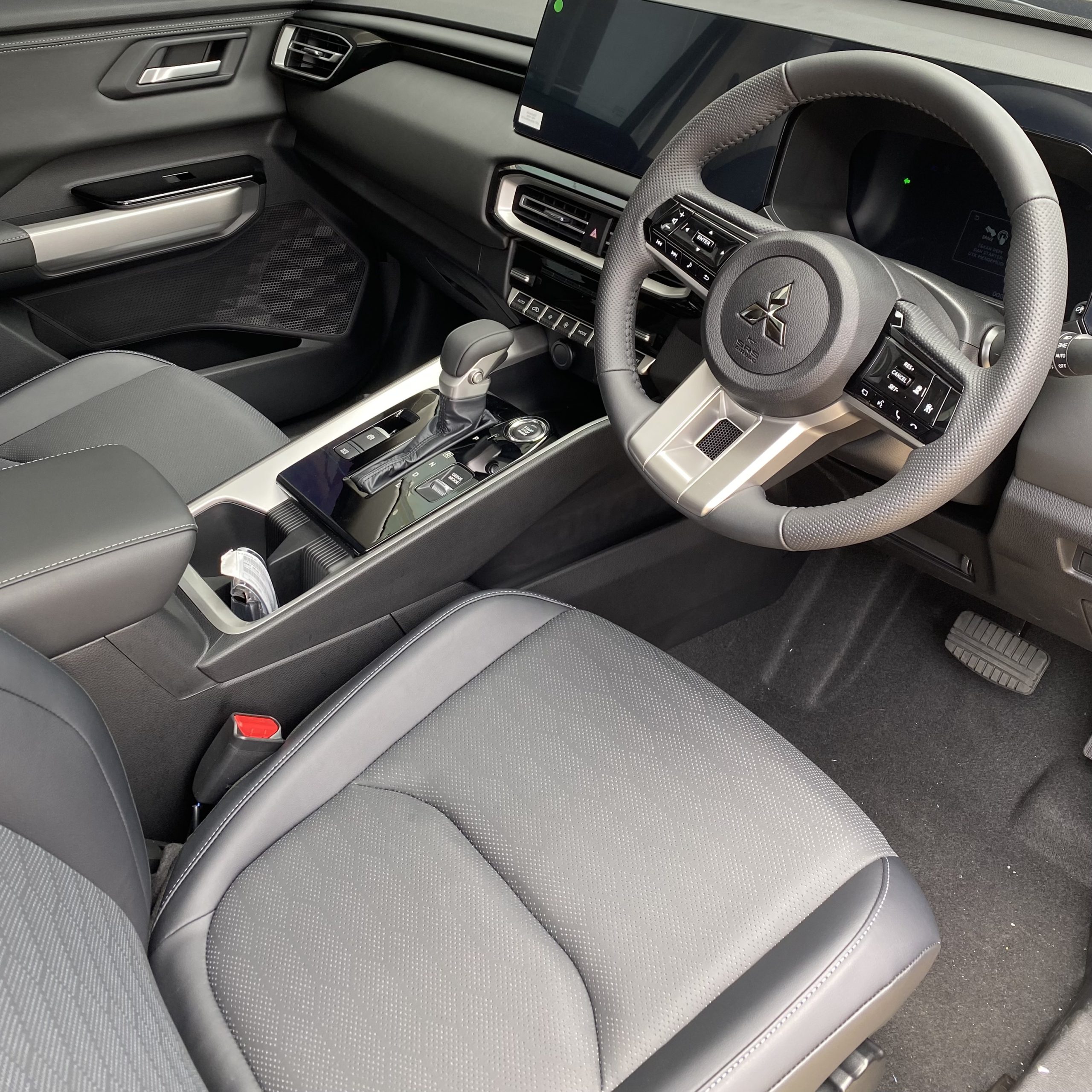 Mitsubishi Triton terbaru warna hitam tampak samping depan, double cabin dengan desain grille besar dan lampu LED modern hitam 2026